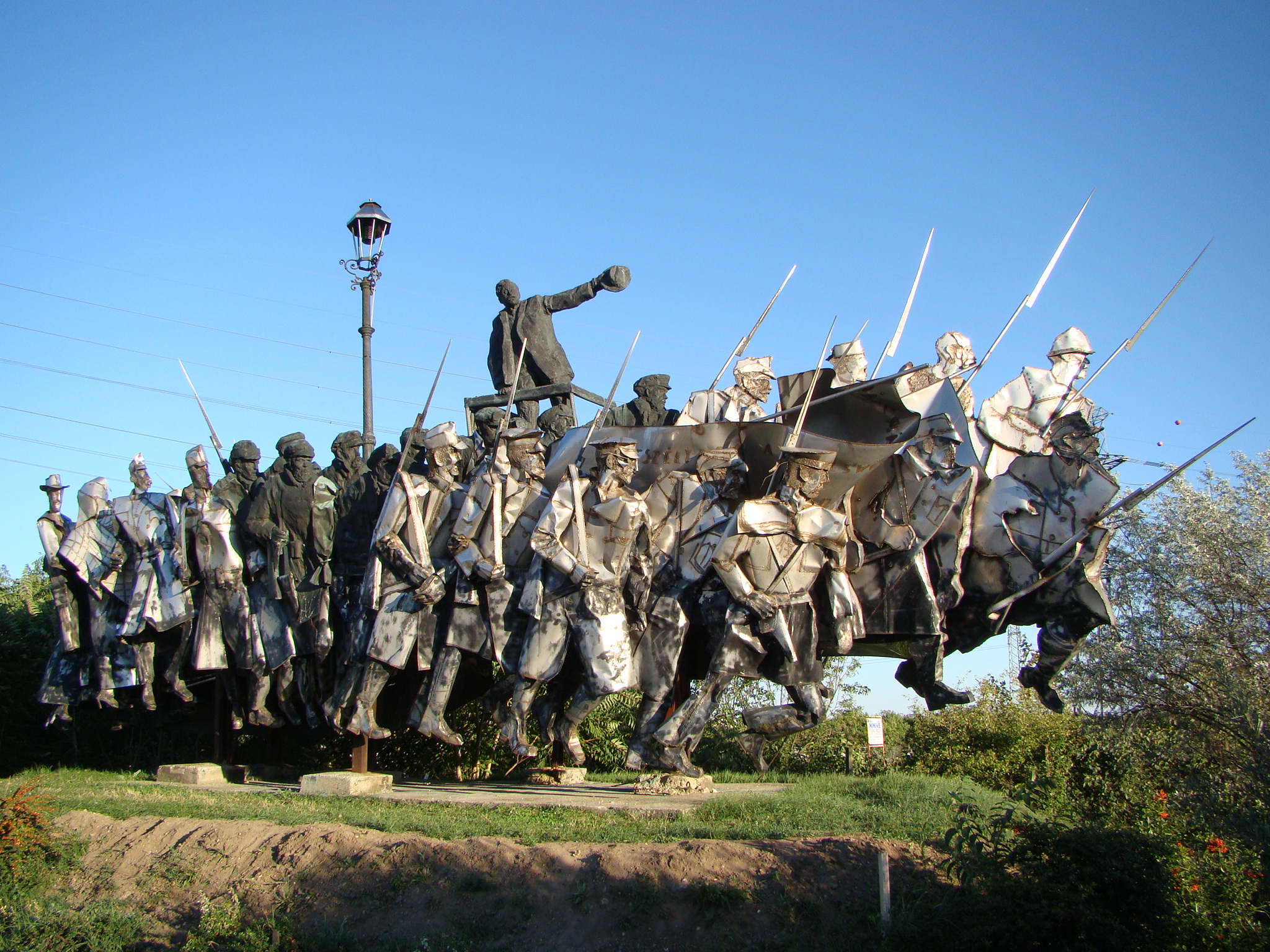 In the little I've read there is no reference to any particular incident this sculpture might represent. Certainly not the revolution itself, which was not an armed uprising but a negotiated agreement. (First strike against it in Lenin's book.) Kun did send a contingent of the new Hungarian Red Army into Slovakia to internationalize the revolution in that direction. The expedition met with some initial success; but its most notable historic feature was Kun's sudden decision to withdraw. In part he was under pressure from the military necessity of countering the increasing threat of the French-Czech-Romanian forces. But a note from French Premier Georges Clemenceau promised to cease hostilities if Hungary withdrew from Slovakia. Kun decided to imitate Lenin's strategic compromise with Germany at Brest-Litovsk to give his own Soviet Republic "breathing room" to build. The withdrawal, however, disintegrated the army and within days Kun and his fellow revolutionaries were fleeing the long way round to Moscow. So that's probably not the memorial's focus.